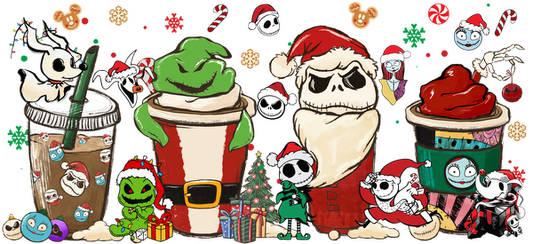 A whimsical holiday-themed design featuring festive characters in Santa hats alongside creatively decorated coffee cups, perfect for seasonal cheer!UV Transfersdtf regular iron