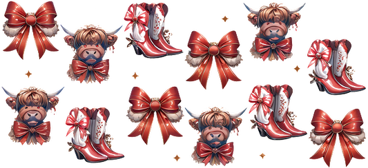 A whimsical collection featuring cute bull-themed designs, stylish red boots, and vibrant bows, perfect for festive decorations or illustrations.UV Transfers dtf prints
