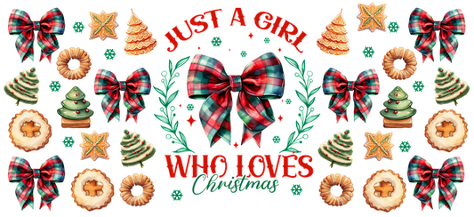 A festive design featuring plaid bows, Christmas trees, cookies, and the phrase “Just a girl who loves Christmas.”UV Transfers heat press transfers