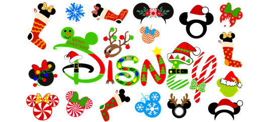 Celebrate the holiday season with this festive Disney-themed graphic featuring colorful Christmas icons and cheerful designs!UV Transfers dtf transfers