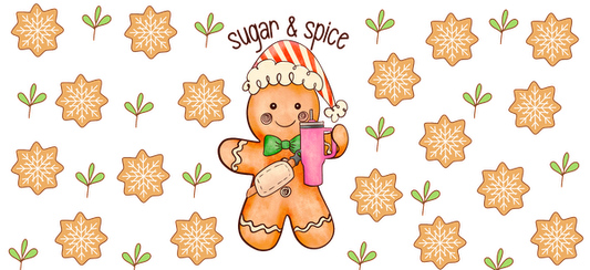 Cheerful gingerbread character wearing a Santa hat holds a drink, surrounded by snowflakes and festive decorations. Perfect for holiday cheer!UV Transfersdtf regular iron