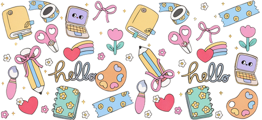 A cheerful array of cute stationery items, including notebooks, scissors, paintbrushes, and colorful embellishments, perfect for creative endeavors!UV Transfers heat press transfers