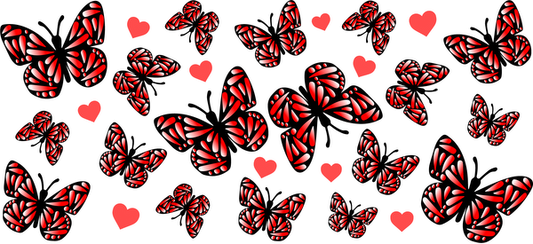 A vibrant pattern featuring red butterflies and hearts, creating a whimsical and romantic design on a black background.UV Transfers dtf transfers