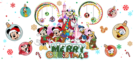 Celebrate the holiday spirit with beloved Disney characters in festive attire, surrounded by colorful decorations and a cheerful "Merry Christmas" message!UV Transfers dtf prints