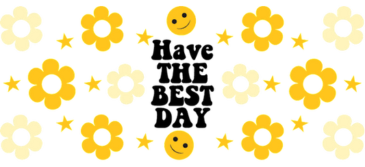 A banner with the words "Have The Best Day" surrounded by smiles and flowers.UV Transfers