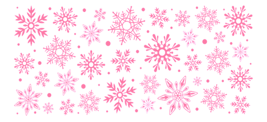 A whimsical pattern of vibrant pink snowflakes in various intricate designs, perfect for festive decorations or winter-themed projects.UV Transfers heat press transfers