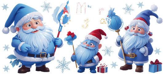 A cheerful collection of cartoon Santa Clauses in various outfits, showcasing playful expressions and festive decorations like presents and ornaments.UV Transfers dtf prints