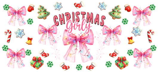 A festive and colorful Christmas-themed design featuring pink bows, gifts, bells, and holiday decorations, perfect for holiday celebrations.UV Transfers dtf transfers