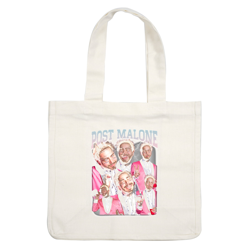 Colorful collage of Post Malone, featuring him in a pink suit, smiling and celebrating in various playful poses.DTF Transfers heat press transfers