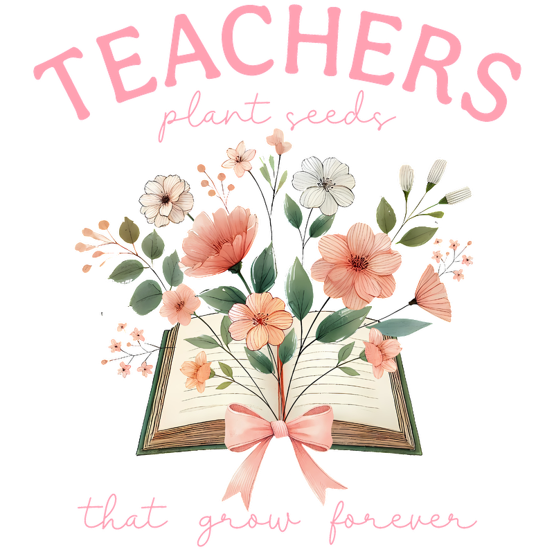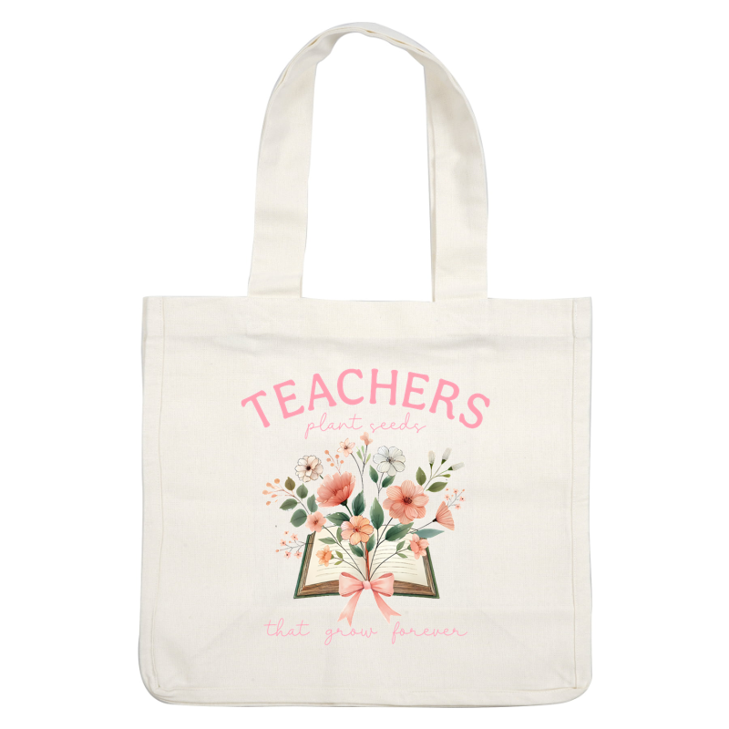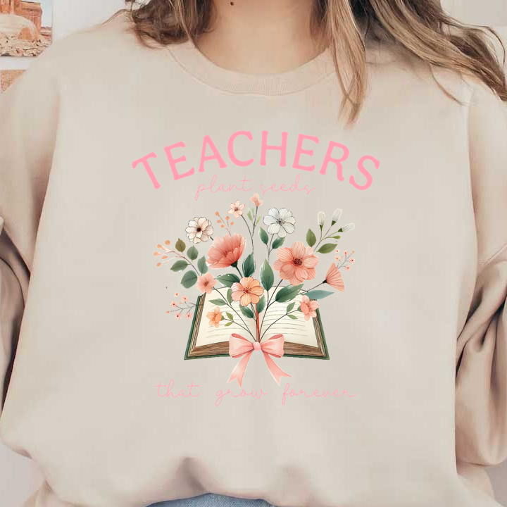 A beautiful illustration featuring an open book adorned with colorful flowers, highlighting the message "Teachers plant seeds that grow forever."DTF Transfers