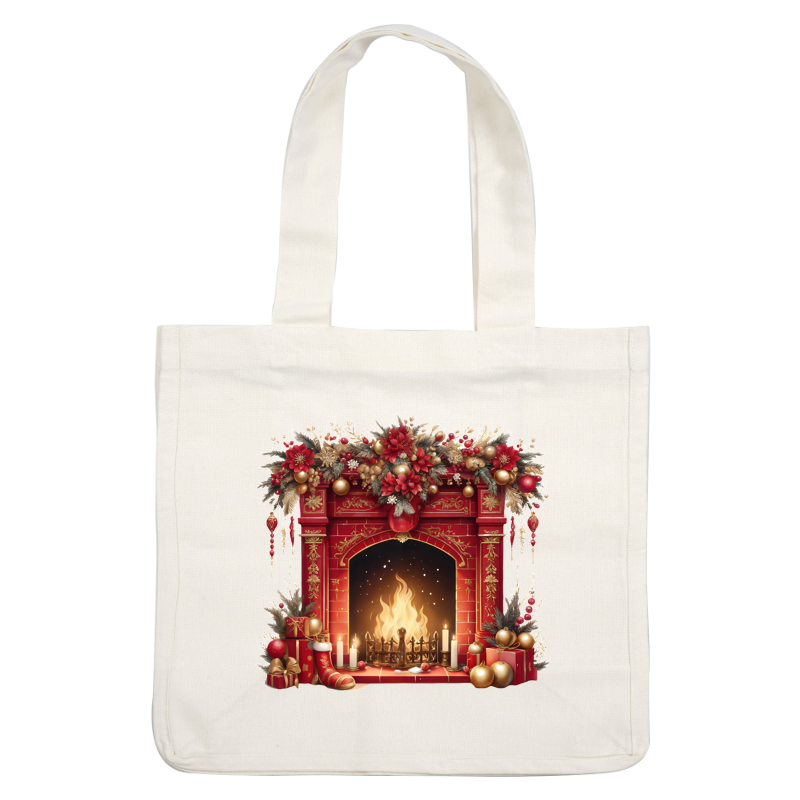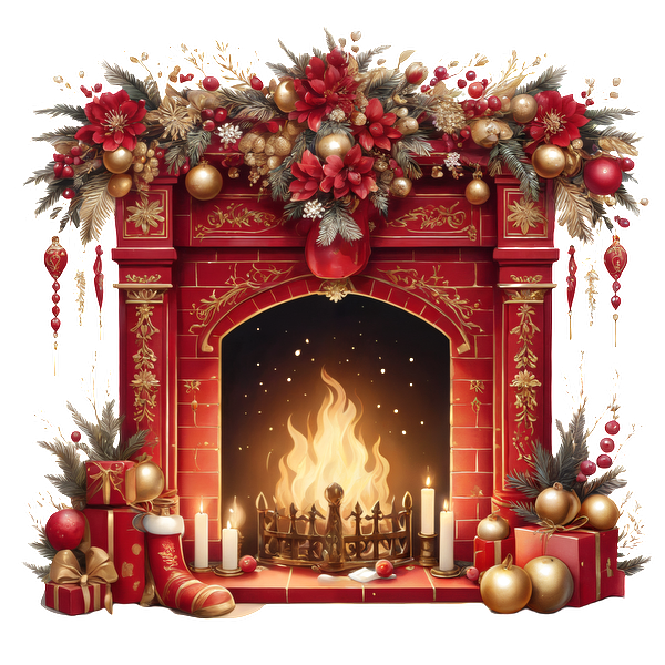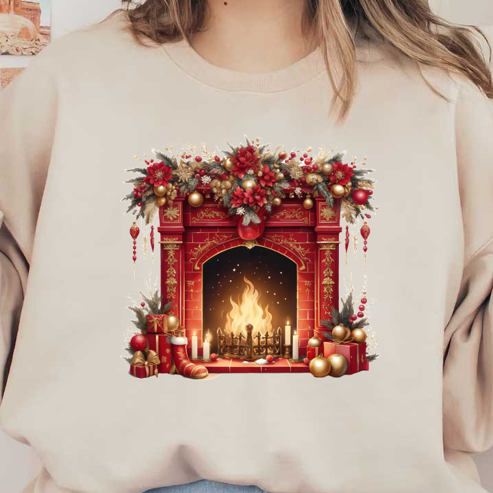 A beautifully decorated red brick fireplace adorned with festive flowers, ornaments, candles, and presents, radiating warmth and holiday cheer. dtf transfers