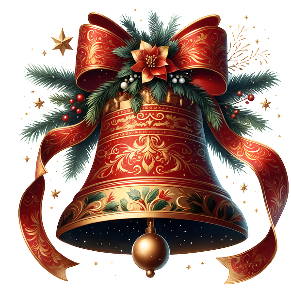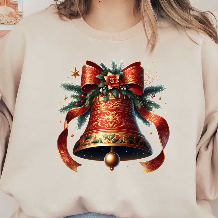 A beautifully decorated red Christmas bell adorned with festive greenery, a large bow, and intricate gold patterns. dtf transfers