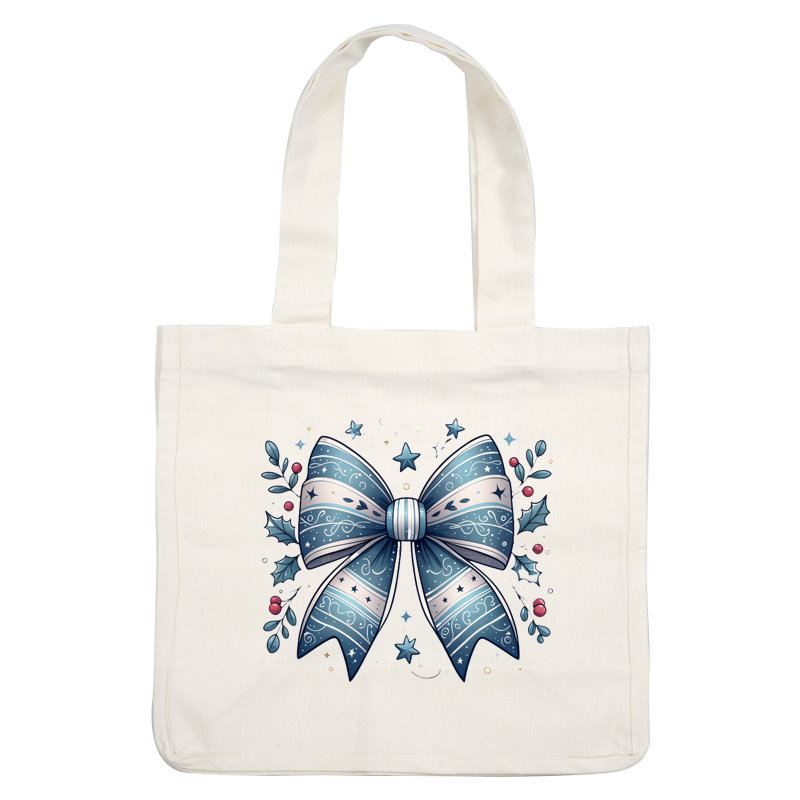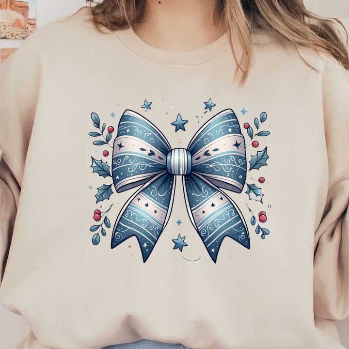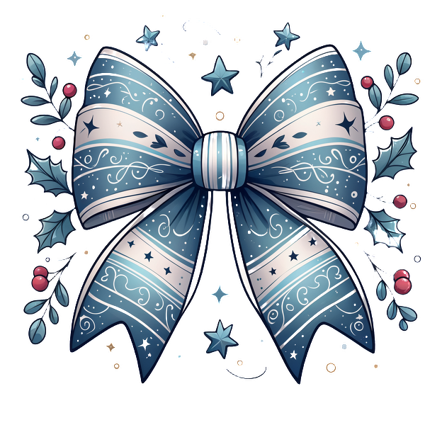 A beautifully designed blue and silver decorative bow surrounded by holly leaves and stars, perfect for festive occasions. heat press transfers