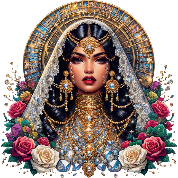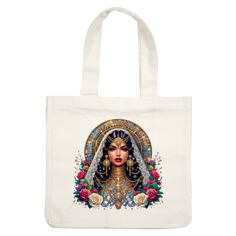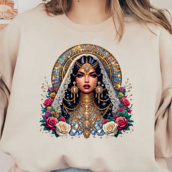 A beautifully detailed illustration of a woman adorned in intricate gold jewelry and a veil, surrounded by vibrant roses and floral accents.dtf regular iron