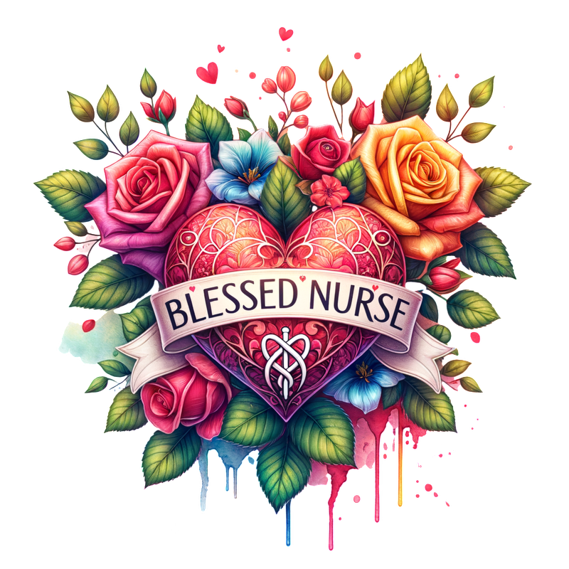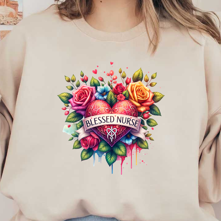 A beautifully illustrated heart surrounded by vibrant roses and flowers, featuring the phrase "Blessed Nurse" on a banner.DTF Transfers