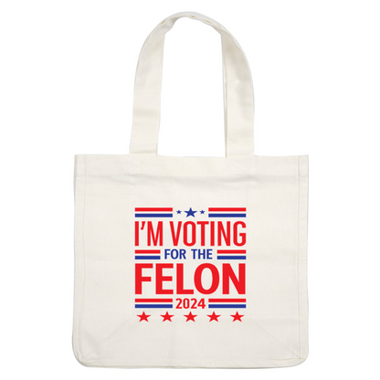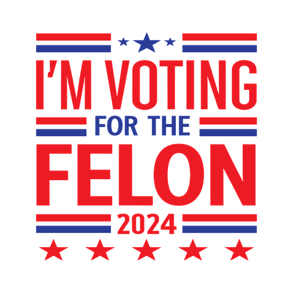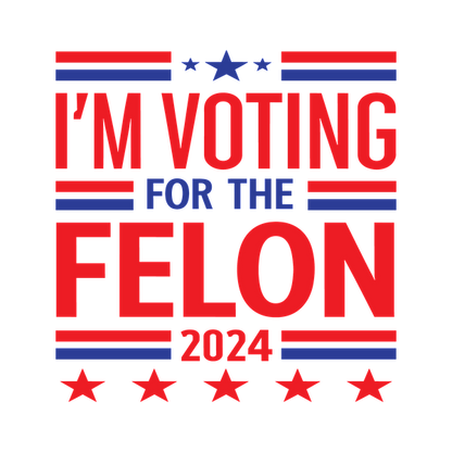 A bold graphic design featuring the phrase "I'M VOTING FOR THE FELON 2024" in red, blue, and white colors. dtf transfers