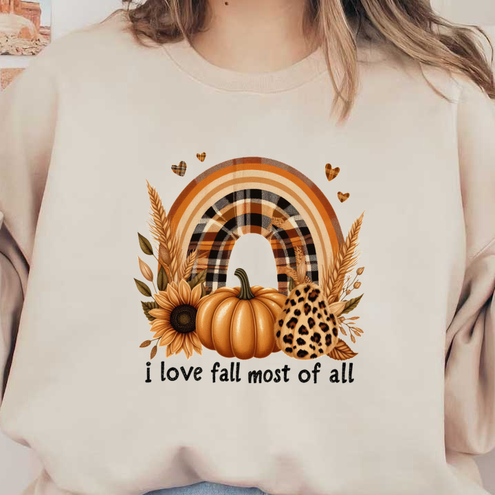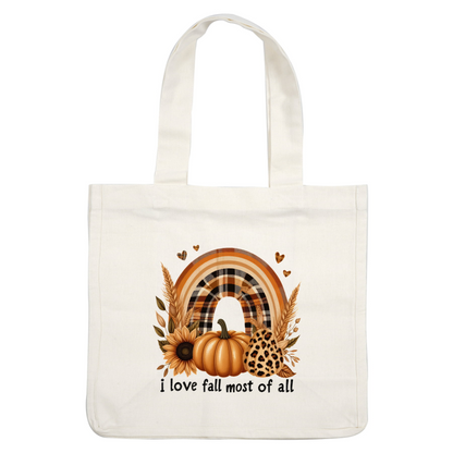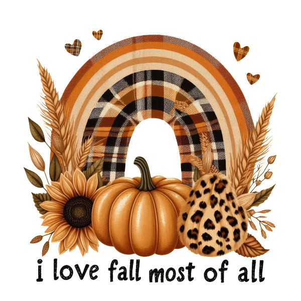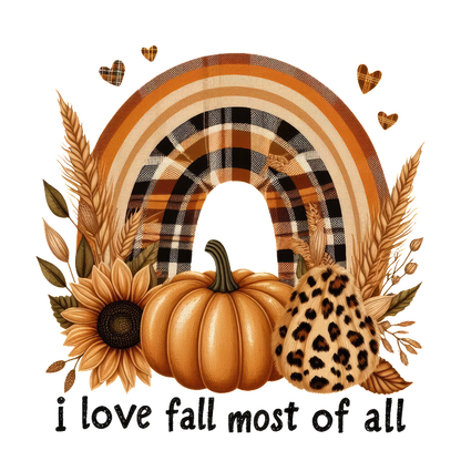 A charming autumn illustration featuring a stylish rainbow, sunflowers, a pumpkin, and a leopard-print gourd with a heartfelt message. dtf transfers