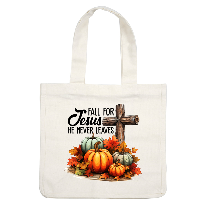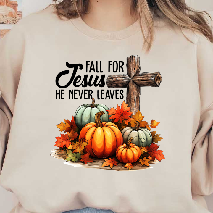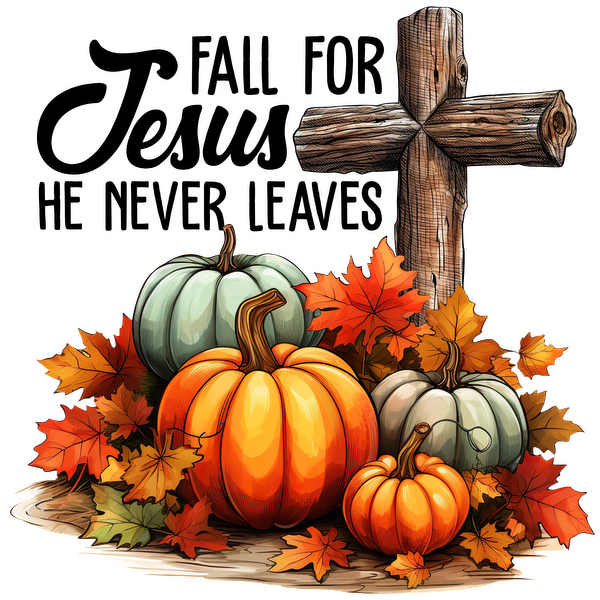 A charming autumn scene featuring colorful pumpkins and vibrant fall leaves, complemented by a rustic wooden cross.dtf regular iron