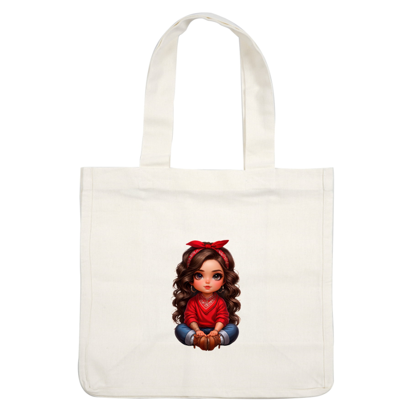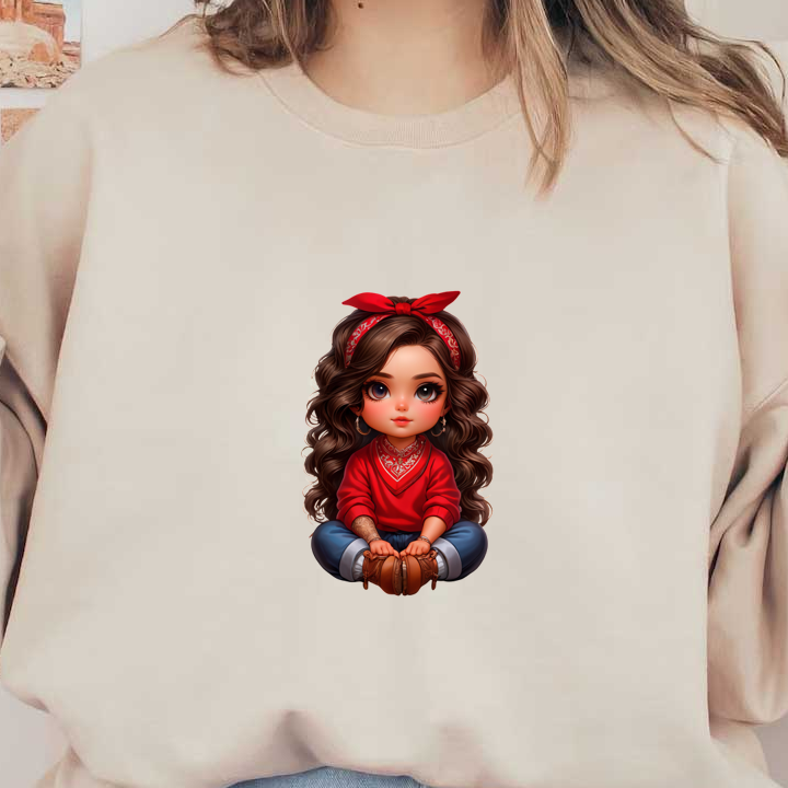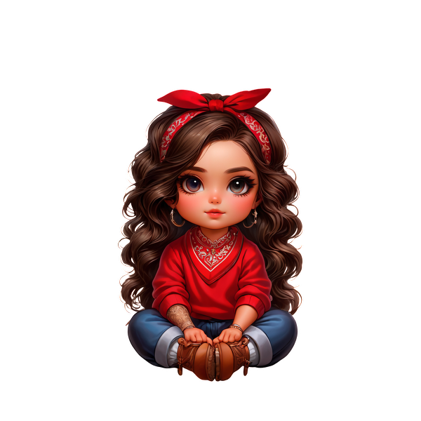 A charming cartoon girl sits cross-legged, wearing a vibrant red sweater, blue jeans, and brown boots, with a red headband. heat press transfers