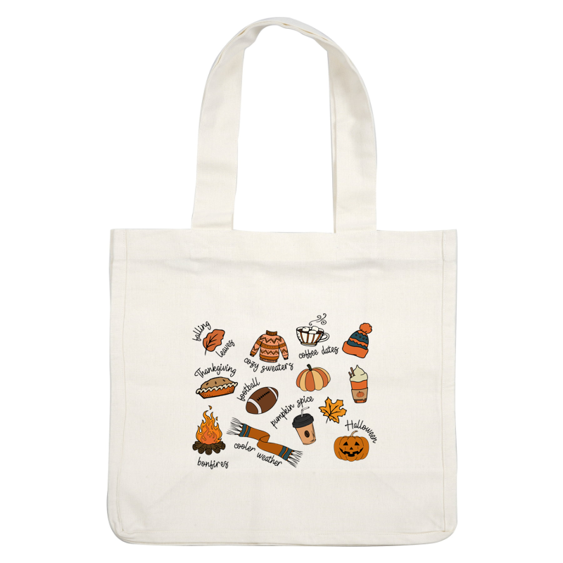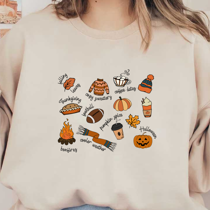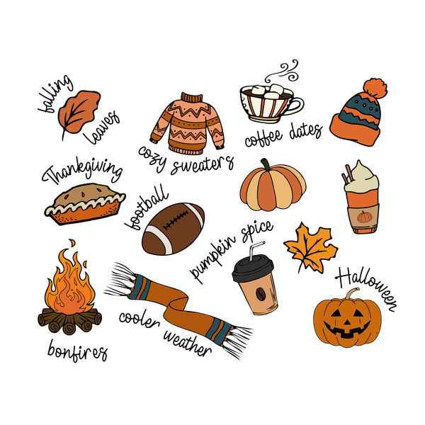 A charming collection of fall-themed illustrations, featuring cozy sweaters, pumpkin treats, hot drinks, and festive decorations. dtf transfers