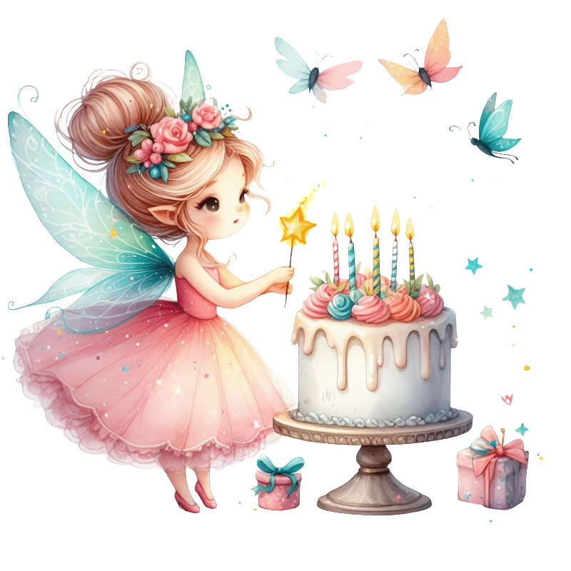 A charming fairy in a pink dress decorates a colorful birthday cake with flowers and candles, surrounded by butterflies and gifts.DTF Transfers