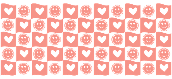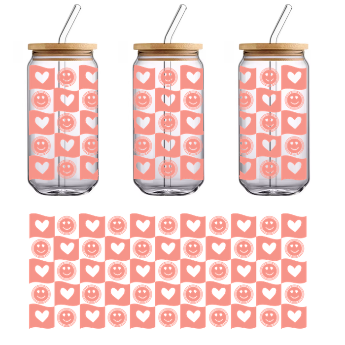 A charming pattern featuring cheerful smiley faces and heart shapes against a soft pink background, perfect for cute designs.UV Transfers heat press transfers