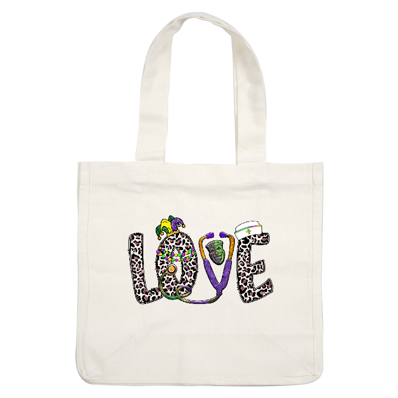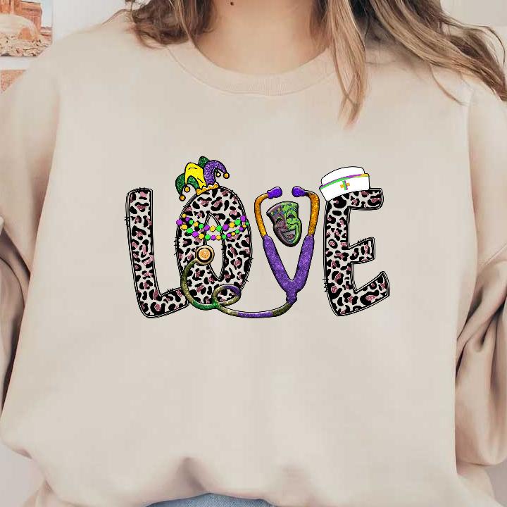 A cheerful and vibrant design featuring the word "LOVE" adorned with Mardi Gras decorations, a playful mask, and a stethoscope.DTF Transfers