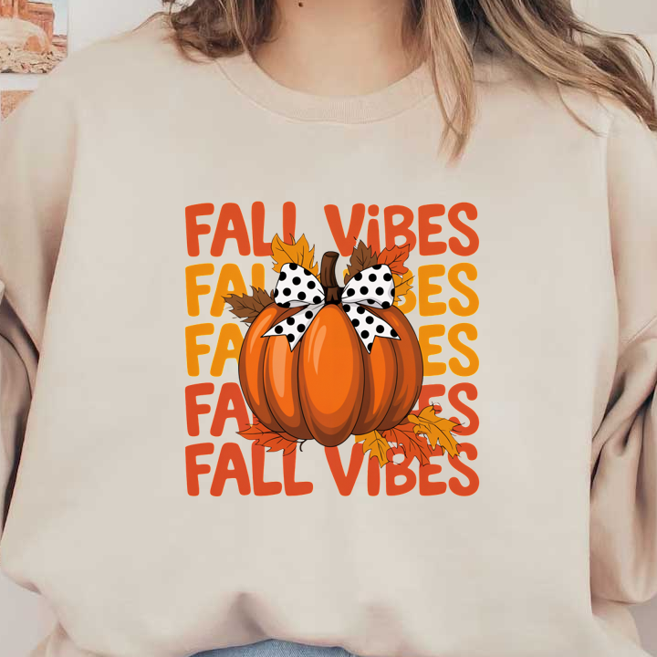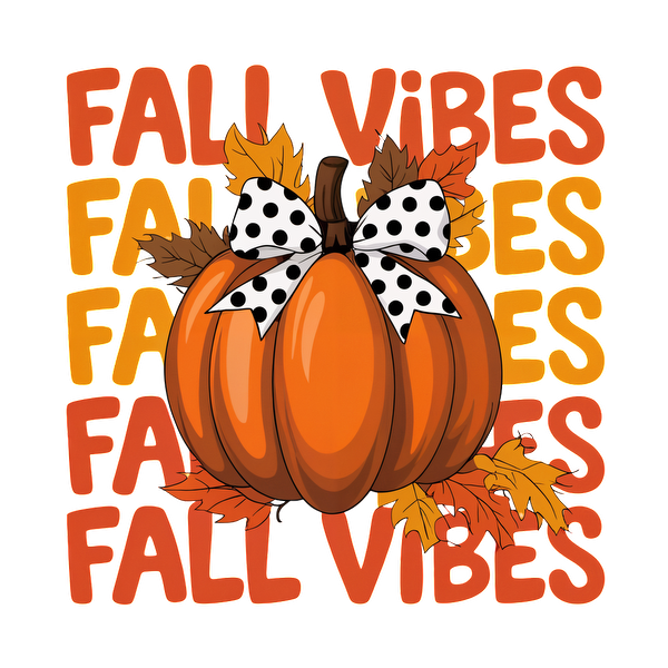 A cheerful autumn-themed design featuring a vibrant orange pumpkin adorned with a polka dot bow and fall leaves, surrounded by "Fall Vibes" text. dtf prints