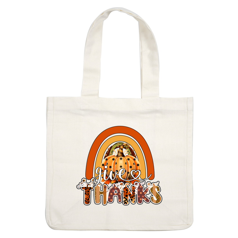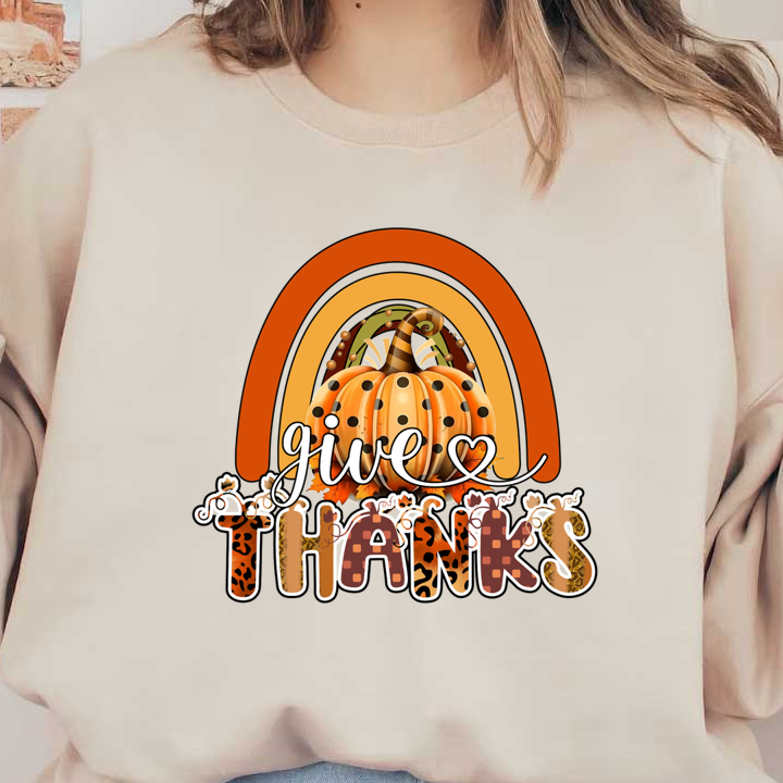 A cheerful autumn-themed design featuring a vibrant rainbow and a polka-dotted pumpkin with the phrase "give thanks." dtf prints