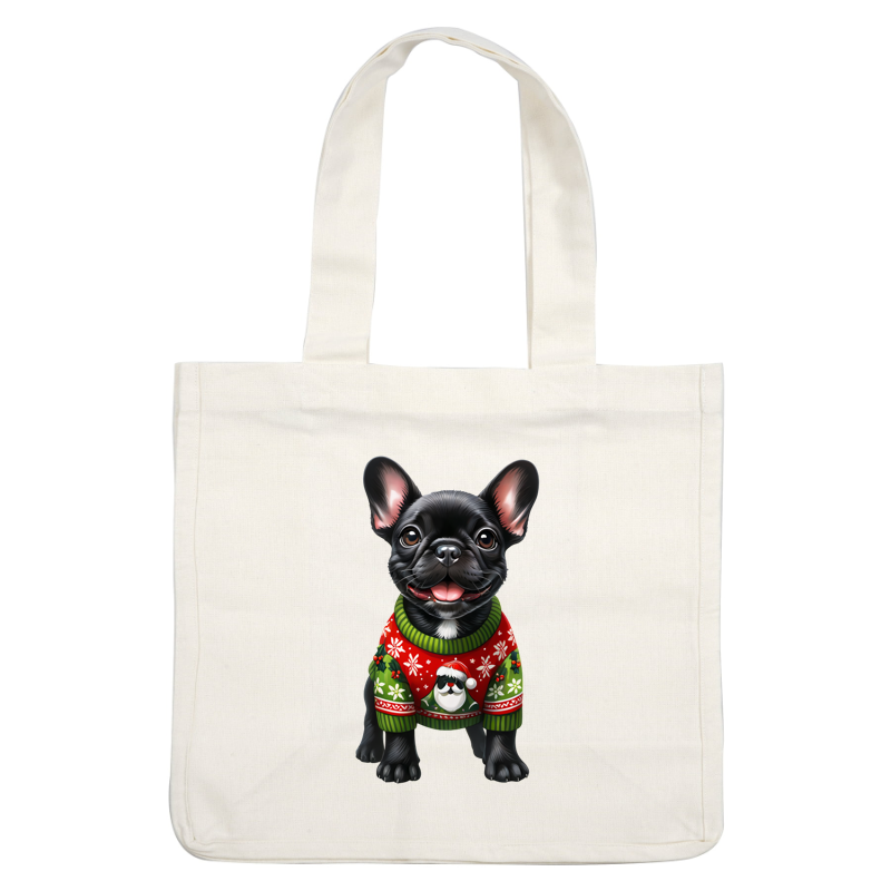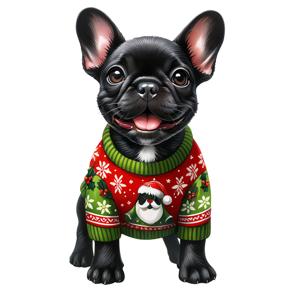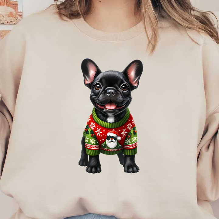 A cheerful black French Bulldog wears a festive red and green Christmas sweater, complete with holiday designs and a playful look. dtf transfers