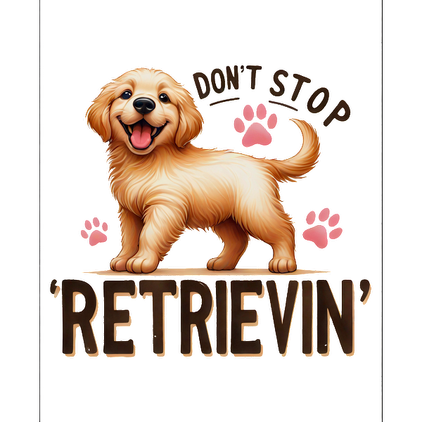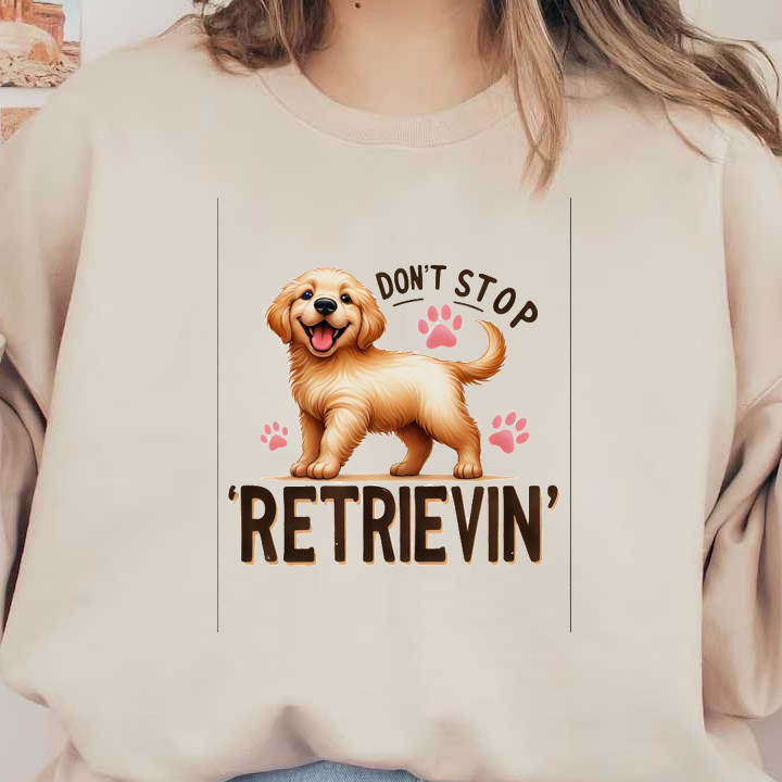 A cheerful cartoon golden retriever is featured with the phrase "Don't Stop 'Retrievin'," complemented by playful paw prints. dtf prints
