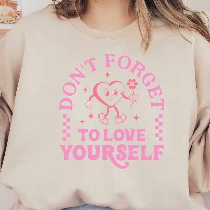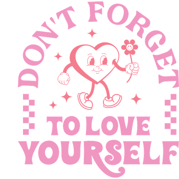 A cheerful design featuring a heart character with a flower, reminding us to love ourselves with a playful message. dtf transfers