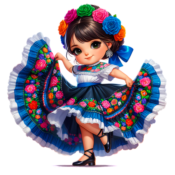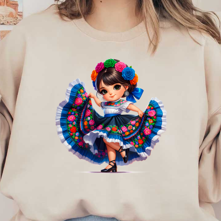 A cheerful girl in a colorful, traditional dress adorned with floral patterns and a vibrant flower crown, dancing joyfully. dtf prints