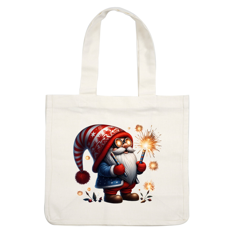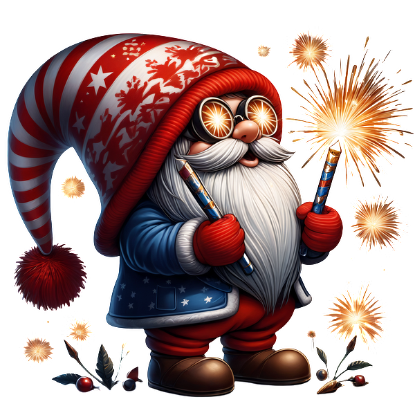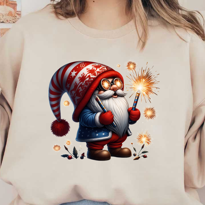 A cheerful gnome in a festive outfit celebrates with sparklers, wearing glasses and a red-white striped hat adorned with stars.dtf regular iron