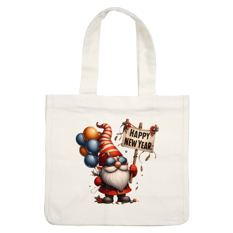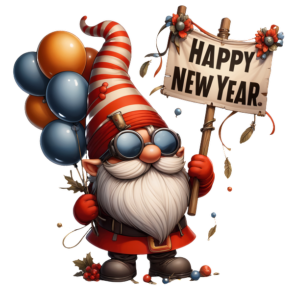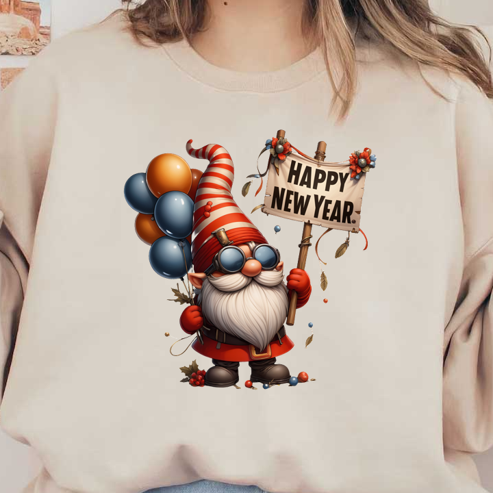 A cheerful gnome in a striped hat holds a "Happy New Year" sign and colorful balloons, celebrating the occasion. dtf transfers