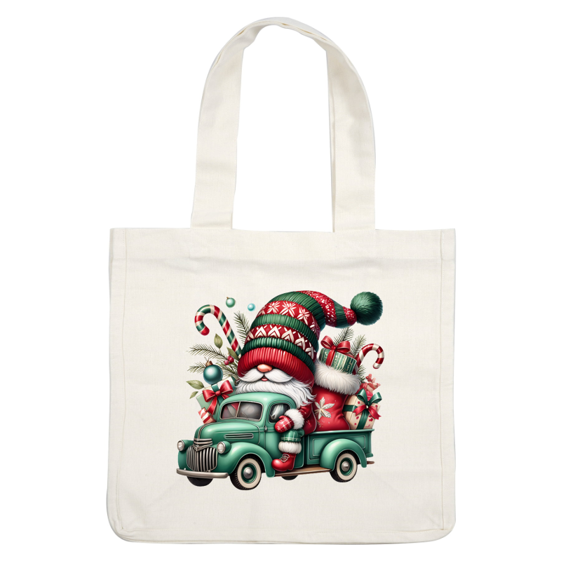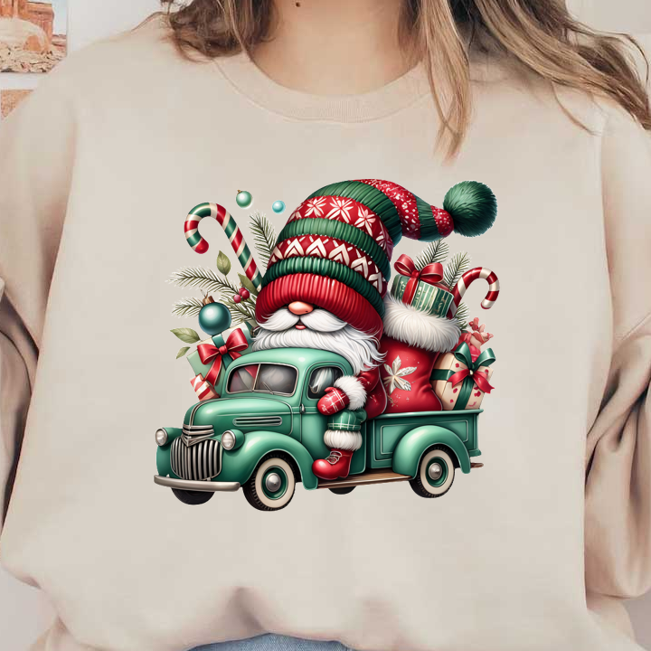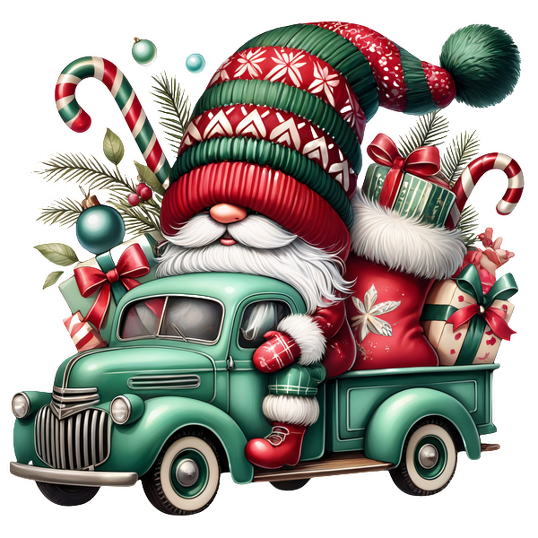 A cheerful Santa in a festive green truck, surrounded by gifts, candy canes, and holiday decorations.DTF Transfers heat press transfers
