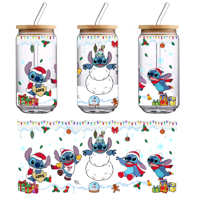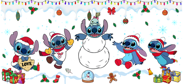 A cheerful scene featuring Stitch and friends celebrating the holidays, surrounded by gifts, decorations, and a snowy snowman.UV Transfers dtf transfers