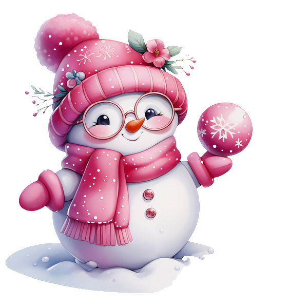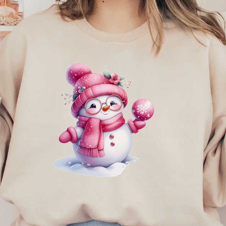 A cheerful snowman dressed in a pink scarf and hat, complete with glasses and holding a snowy pink ornament.dtf regular iron