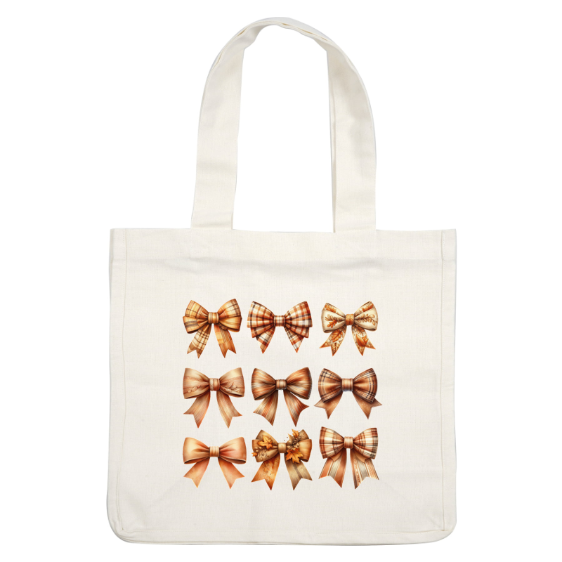 A collection of ten beautifully crafted decorative bows in warm autumn colors, featuring various patterns and textures.dtf regular iron