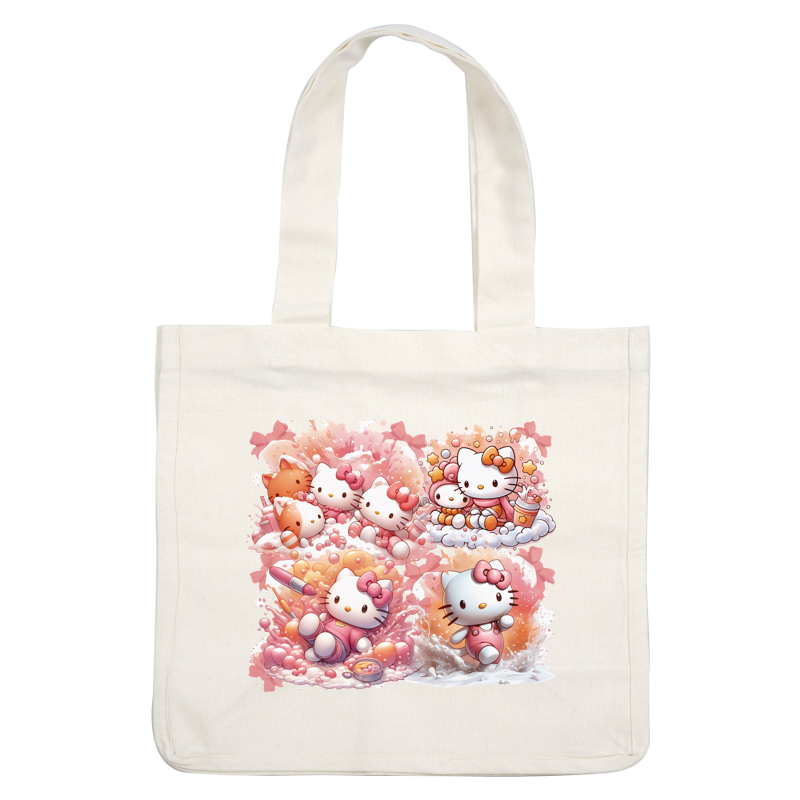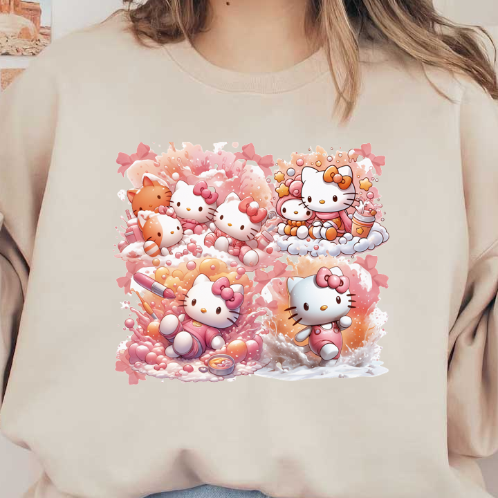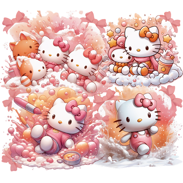 A colorful collection of adorable Hello Kitty illustrations featuring playful scenes with friends, bubbles, and sweet pastel colors.DTF Transfers dtf transfers