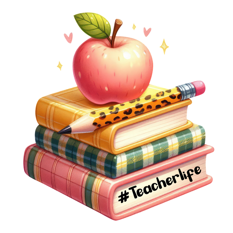 A colorful stack of books topped with a shiny red apple and a playful leopard-print pencil, celebrating #Teacherlife!DTF Transfers