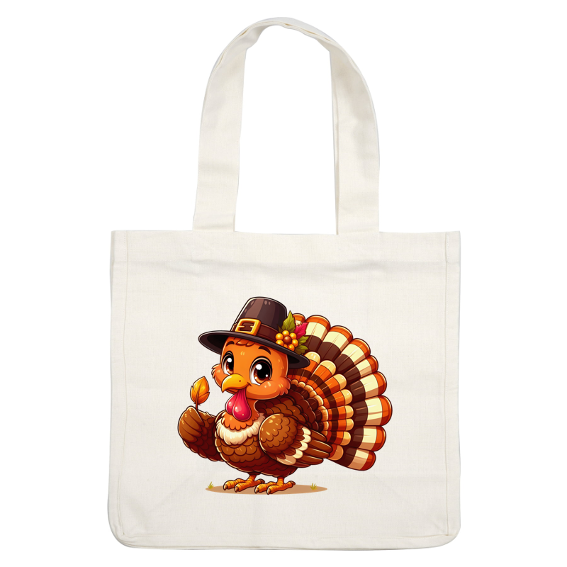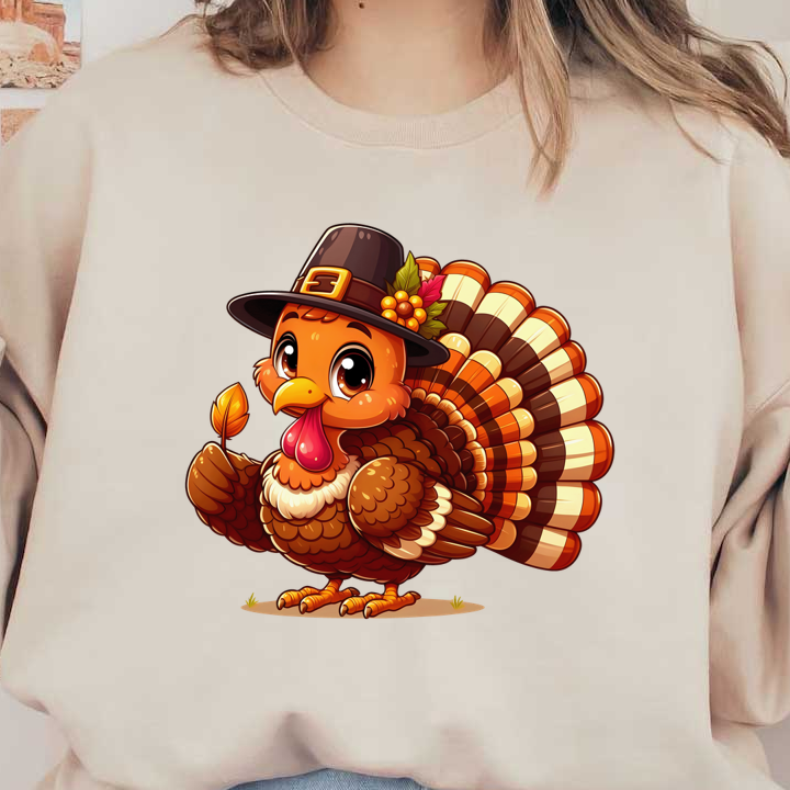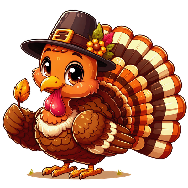 A cute cartoon turkey wearing a pilgrim hat and holding a leaf, celebrating Thanksgiving with vibrant colors and a cheerful expression. dtf prints