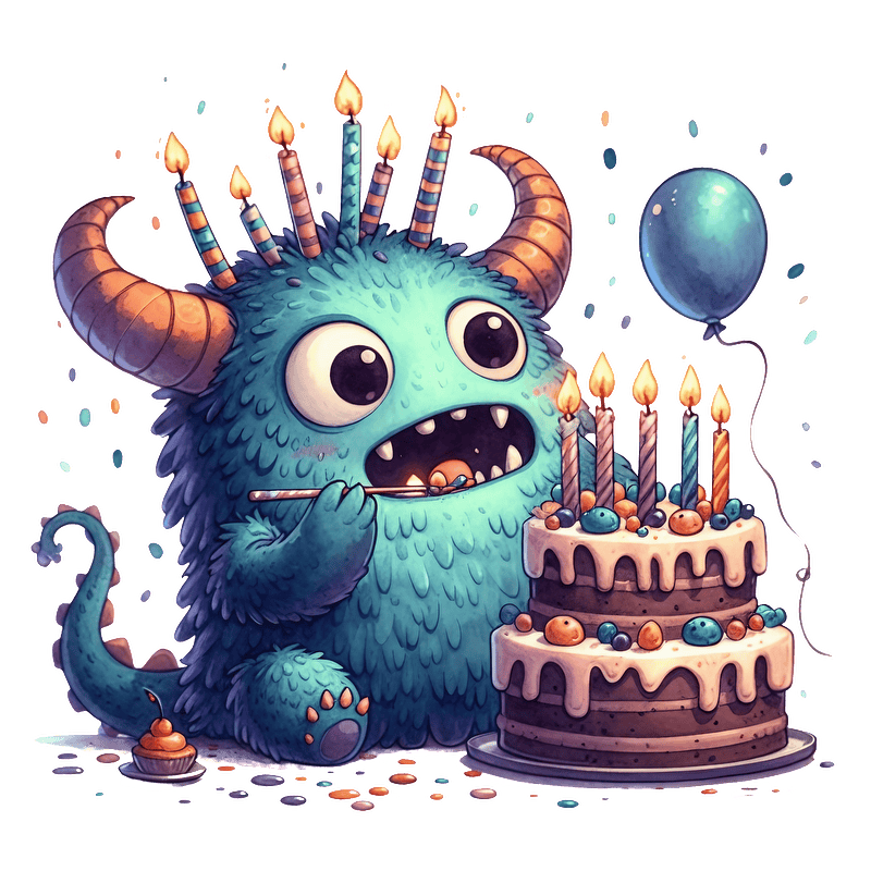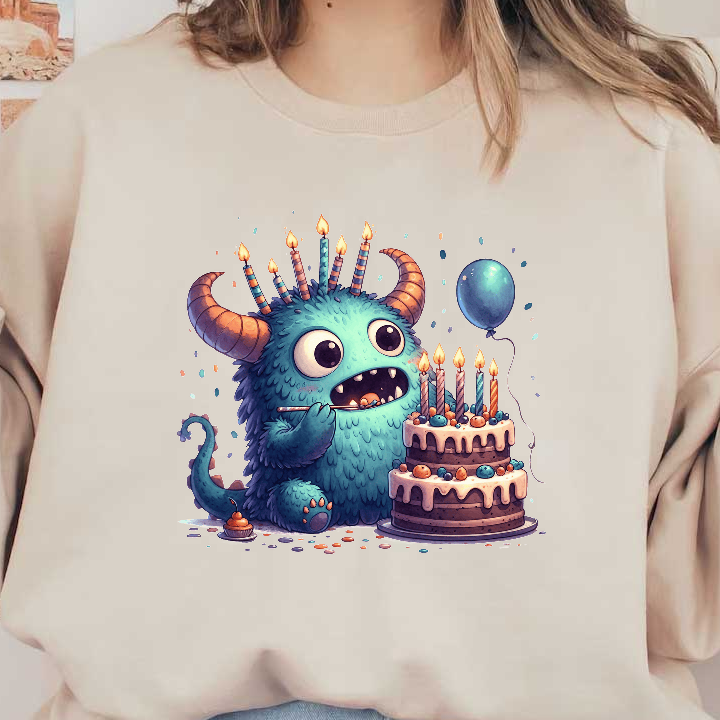 A cute, fluffy blue monster celebrates a birthday with a delicious multi-layered cake topped with colorful candles and decorations.DTF Transfers