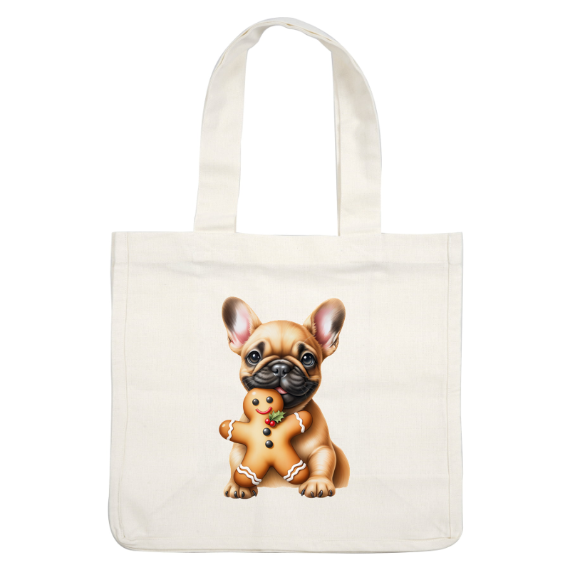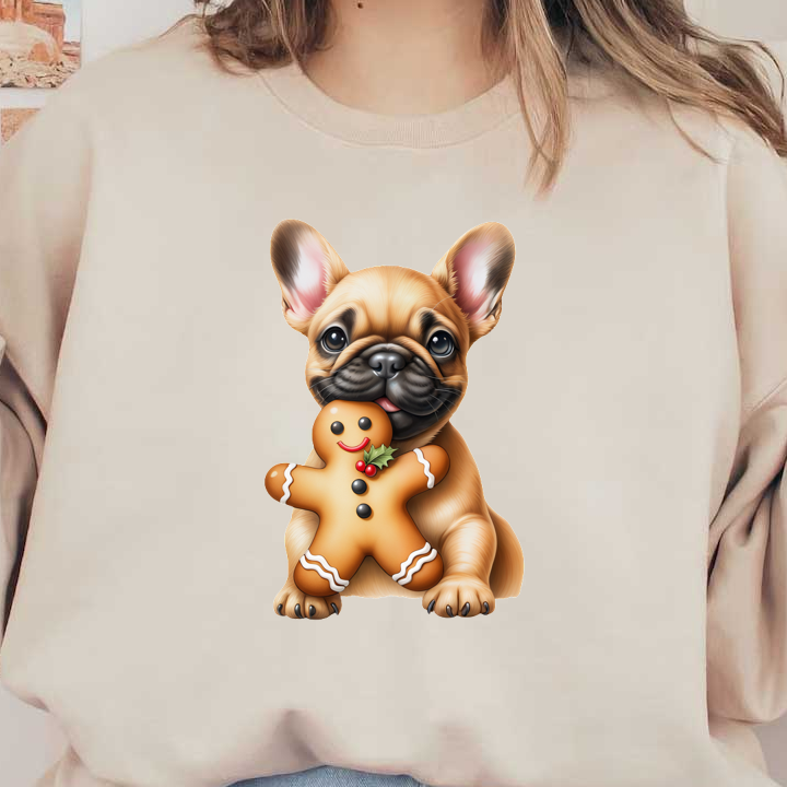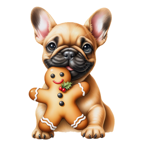 A cute French Bulldog holds a cheerful gingerbread man cookie, decorated with icing and festive accents. heat press transfers