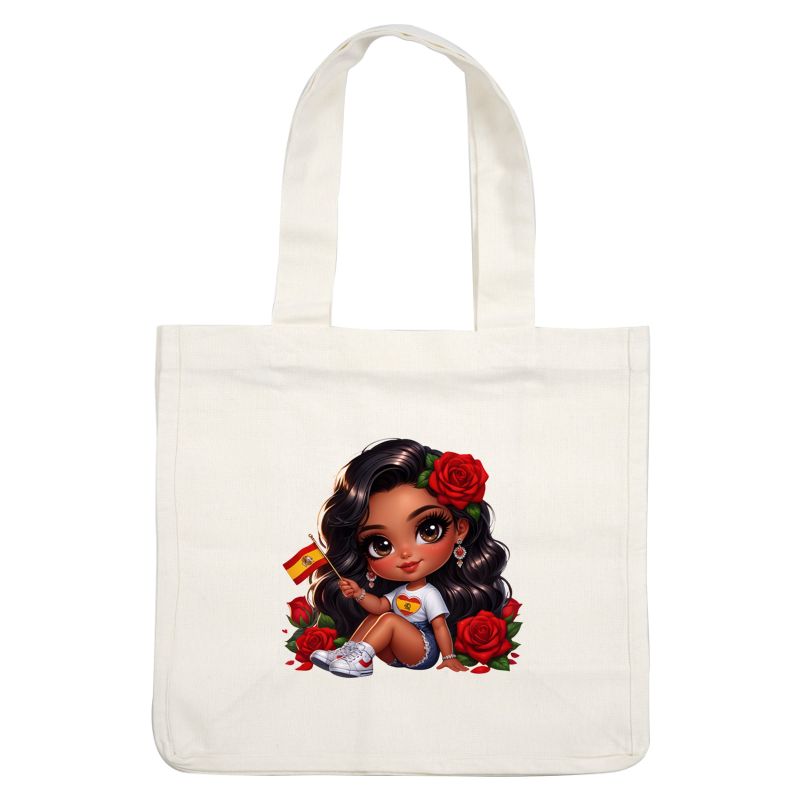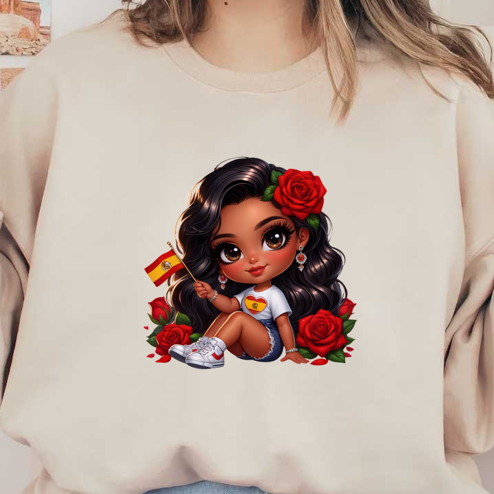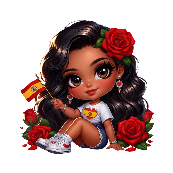 A cute girl with long, wavy hair, dressed in a T-shirt and shorts, holding a Spanish flag amidst red roses.DTF Transfers heat press transfers