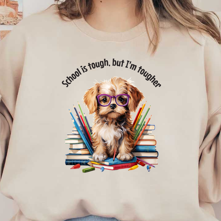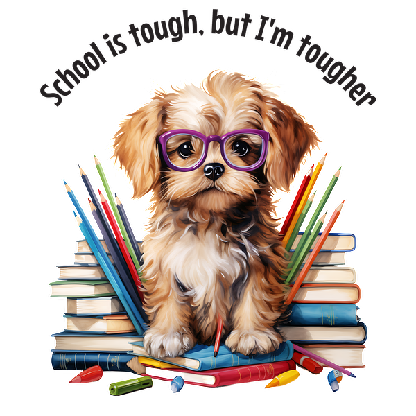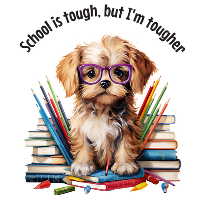 A cute puppy wearing glasses sits atop a stack of books, surrounded by colorful pencils, emphasizing resilience with the phrase, "School is tough, but I'm tougher." heat press transfers