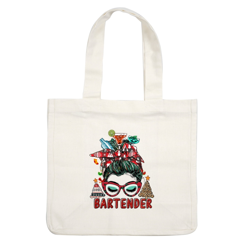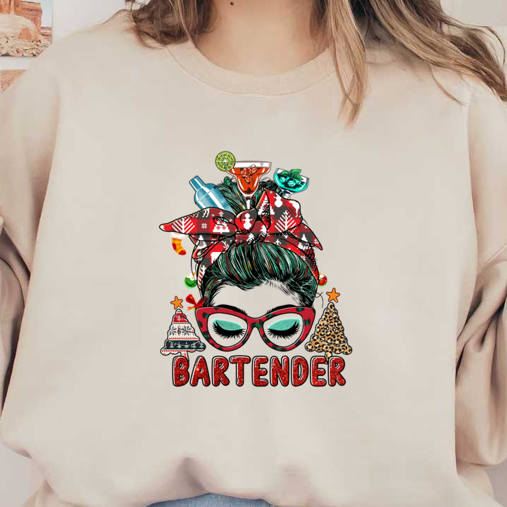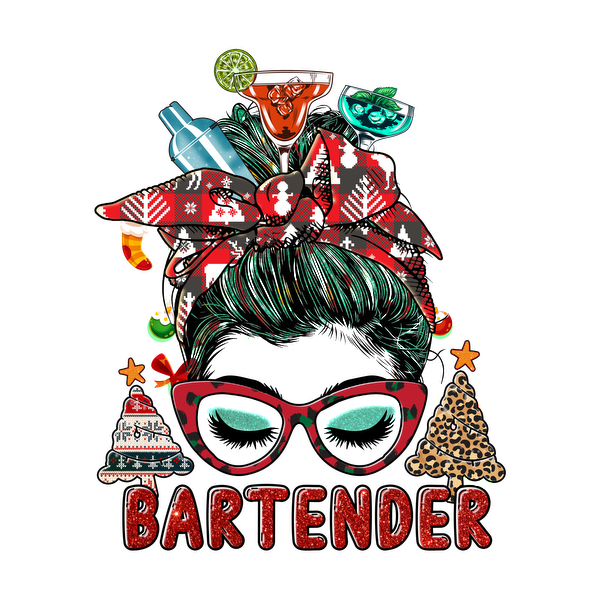 A festive bartender graphic featuring a stylish bun, vibrant drinks, and holiday elements, perfect for celebrating the season!dtf regular iron