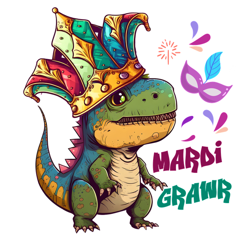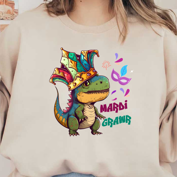 A festive cartoon dinosaur wearing a colorful Mardi Gras crown, surrounded by playful decorations and vibrant text.DTF Transfers