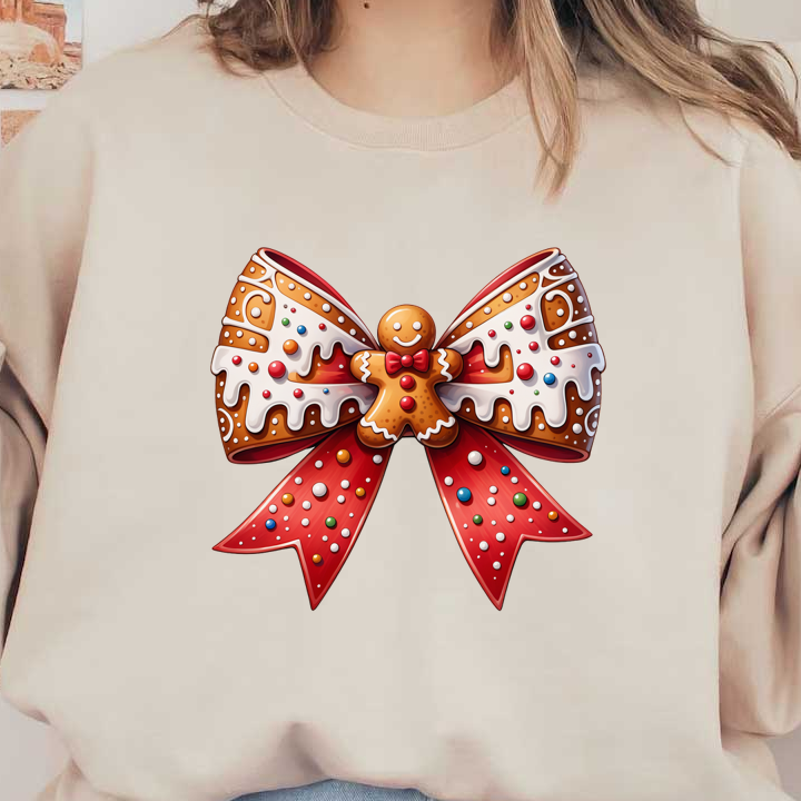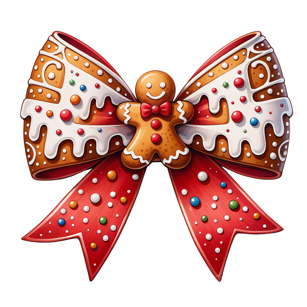 A festive gingerbread bow featuring colorful icing, sprinkles, and a cheerful gingerbread man centerpiece, perfect for the holidays! heat press transfers