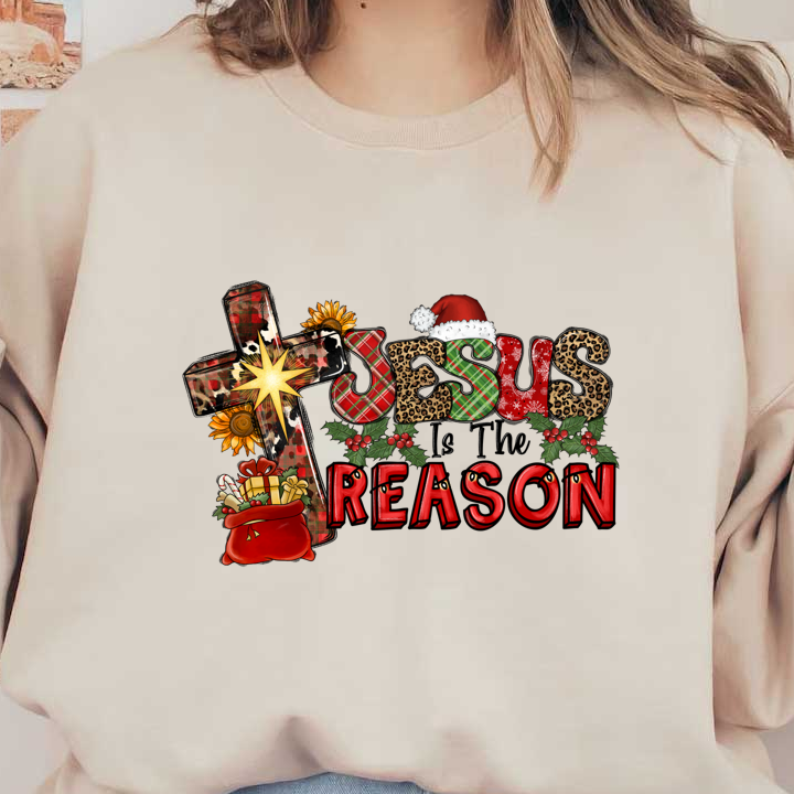 A festive graphic featuring a cross and playful lettering that says "Jesus is the Reason," adorned with Christmas elements.DTF Transfersdtf regular iron